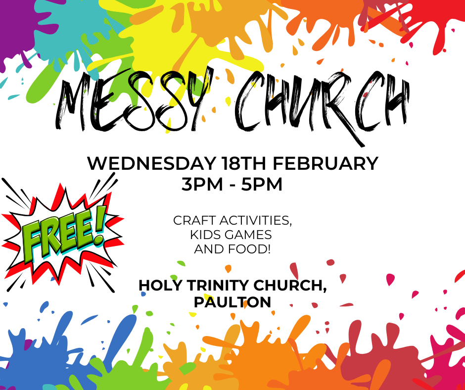 Next week is half-term so no Toddler groups or Messy Church on Wednesday 18th of February 3-5pm - Please do let me know if you are available for help with this!